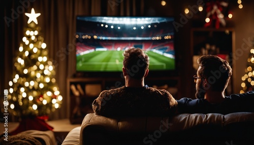 at home group of soccer fans on couch watch sport game on TV, online bet, celebrate team wins championship. Friends cheer eat snacks, watch favorite football club play, Christmas eve, Christmas tree