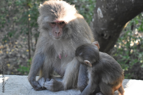monkey, macaque, mother, baby, infant, family, wildlife, primate, parenting, nature, animal, bonding, tender, protective, wild, outdoors, mammal, habitat, portrait, care, sitting, forest, tree, jungle, survival, zoology, closeup, fur, sunlight, high contrast, day, blurred background, concrete, stone, sharpened, looking down, connection