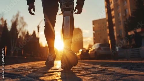 athlete man with prosthetic leg walking outdoor, close up at disabled young man with prosthetic leg walking along the street, prostheses standing, one way to win is to be yourself, generate by AI.
