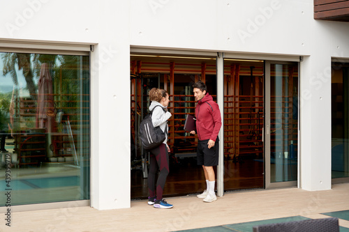 activity, assist, assistance, athlete, backpack, break, chat, client, coach, colleague, communicate, contemporary, conversation, collaborating, device, direction, negotiate, fit, fitness, full body, full-length, contraption, gym, healthy, instructor, laptop, learn, lifestyle, modern, motivation, outdoors, partner, personal trainer, physical, rest, speak, sport, sportsman, activewear, sportswoman, stamina, talk, teamwork, together, trainee, trainer, training, vitality, well-being, wellness, physical exercise