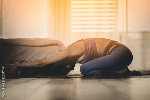 Athletic Asian woman practice yoga Child's pose to meditation in bedroom after wake up in the morning Feeling so comfortable and relax,Healthcare Concept