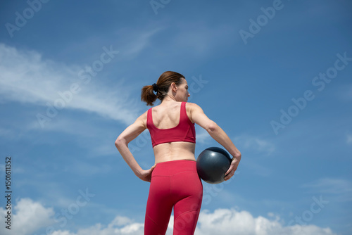 athlete, woman, holding, blue, sky, fitness, exercise, activewear, strength, health, active, training, backview, motivation, determination, wellness, lifestyle, female athlete, outdoors, physical exercise, energy, sport, ball, goal, power, fit, healthy, dynamic, activewear, sharpened, discipline, well-being, action, personal trainer, female, caucasian, pilates, summer, exercising
