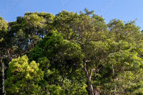 Atlantic forest and rainforest. Row of trees and bushes. Blue sky background. Itaipava, Rio de Janeiro, Brazil