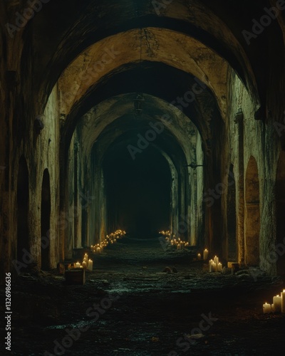 Atmospheric Candlelit Tunnel View with Stone Arches and Dim Lighting Creates a Mysterious and Dramatic Scene