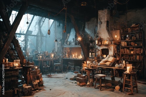 workshop, interior, dimly, lit, cluttered, atmospheric, candle, item, table, chair, book, shelf, wooden, beam, ceiling, window, hanging, rope, plant, desk, smoke, fire, alcove, wall, rustic, old, vintage, fantasy, magic, spell, craft, studio, attic, workspace, storage, light, darkness, shadowy, eerie, moody, detailed, composition, perspective, sharpened, still, vignette, setting, scene, atmosphere