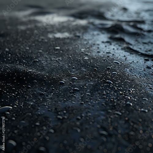 Atmospheric macro shot of water droplets on dark reflective surface creates moody ambiance, perfect for backgrounds, weather concepts, and minimalist design projects.