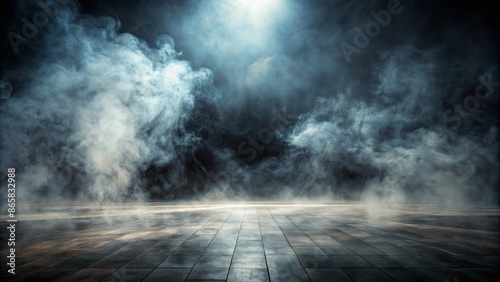 Atmospheric scene of eerie darkness with mysterious fog or smoke swirling across the empty floor, evoking foreboding and suspense.