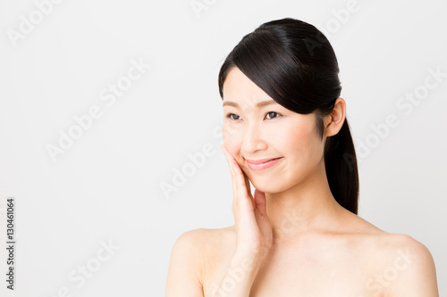 woman, people, cosmetic, health, skincare, make-up, make-up, bare skin, radiancy, glossy, teak, cheek, smile, decollete, waist up, portrait, beauty, clean, appealing, sweet, white, studio, copy space, japanese, asian, chinese, cut-out, background