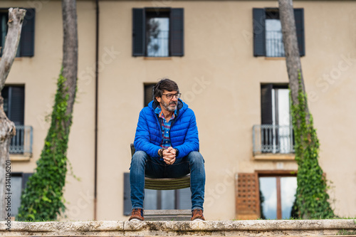 attractive bearded man sitting in a garden looking at the smartphone