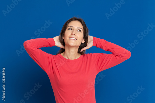 Attractive brunette girl wearing a red T-shirt