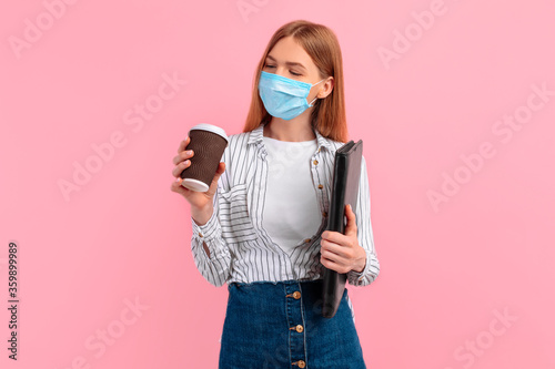 attractive business woman in a protective medical mask on her face, holding a folder with documents and a cardboard Cup of coffee, on a pink background