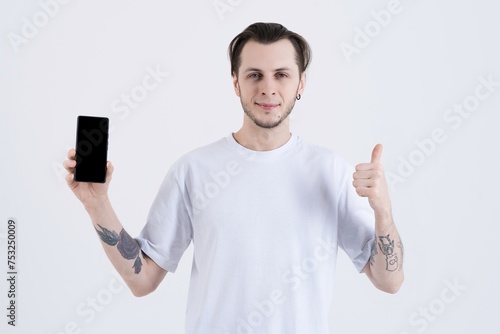 Attractive Caucasian young man with tattoos in casual clothing shows thumb up and mobile phone screen with blank copy space for advertisement isolated on white studio background.