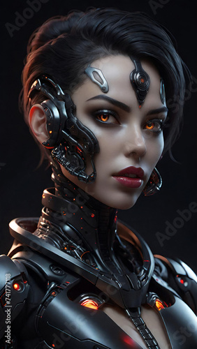woman, fashion, beauty, hair, glamour, black, face, vampire, make-up, lady, person, fantasy, style, art, people, gothic, dark, halloween, make-up, sensuality, coiffure, lip, body, cyborg, generative, ai, illustration, robot, warrior