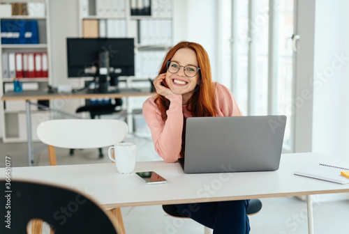 woman, office, laptop, businesswoman, workplace, computer, seated, 20s, redhead, 20s, young, person, professional, men at work, high key, employee, desk, friendly, greeting, secretary, smiling, approachable, executive, business, corporate, attentive, eye contact, adult, female, job, people, sitting, technology, work