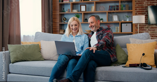 Attractive happy smiling married adult couple sitting on the sofa a t home and uses laptop to review their family photos,leisure concept