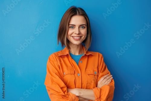 woman, background, person, happy, business, young, shirt, blue, lady, confident, work, men at work, agent, student, manager, model, hair, folded, businesswoman, expression, nice, female, attractive, brown, job, fun, bob, style, mood, joy, broker, good, positive, pretty, lifestyle, emotion, fashion, trendy, stylish, orange, hand, beautiful, coiffure, leisure, arm, cheerful, crossed