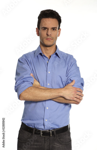 man, male, attractive, adult, caucasian, european, business, businessman, arm, crossing, offended, mad, angry, speechless, studio, studio shot, interior, high key, white, blue, black