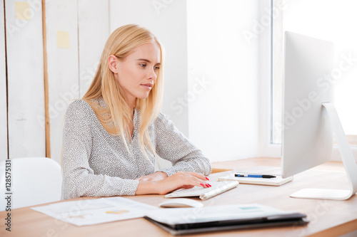 Attractive smiling business woman working with laptop in office