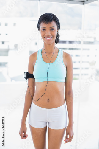 young adult, woman, female, indoor, home, house, household, apartment, domicile, abode, window, bright, black hair, active, fit, toned, healthy, fitness, health, physical, shape, activewear, sporty, sports bra, exercise, standing, pretty, beautiful, attractive, happy, smiling, cheerful, portrait, wearing, earphones, listening, music, enjoying