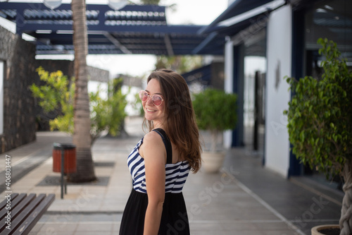 Attractive stylish caucasian girl is very happy and smiles because she is on vacation in an exotic location