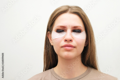 attractive woman in beauty salon on facial hair removal eyebrows threading procedure