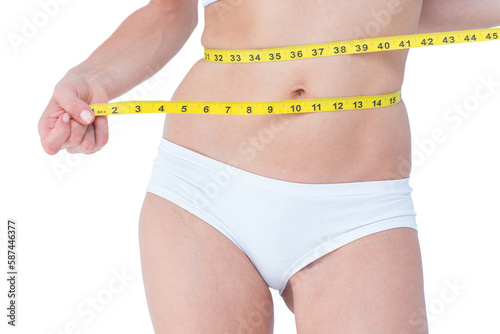 one person, young adult, woman, female, caucasian, healthy, slim, body, lifestyle, standing, weight, belly, waist, thin, dieting, fitness, figure, abdomen, holding, toned, achievement, success, weight loss, losing weight, measuring, measuring tape, underclothing, white