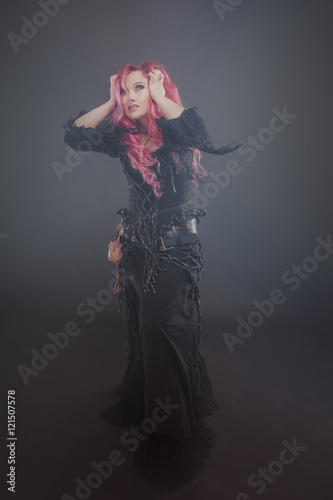 Attractive woman with red hair in witches costume, in the fog, clutching her head