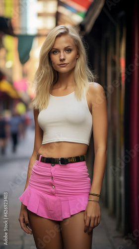 pink, woman, attractive, sexy, fashion, skirt, mini, street, view, vertical, full, body, blond, blond, hair, straight, long, colours, summer, outfit, spring, female, beautiful, person, dress, health, beauty, holiday, miniskirt, lifestyle, lady, romantic, shiny, background, passion, sensuality, fluttering, femininity, valentine, happy, luxury, desire, skin, love, girl, caucasian, crop top
