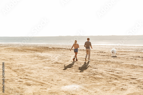 holiday, photogenic, couple, woman, friendship, beauty, boyfriend, happy, cute, summer, sea, samoyed, romantic, walking, casual attire, vacation, man, together, pet, smiling, pretty, attractive, relaxation, cheerful, girl, honeymoon, friends, girlfriend, coast, puppy, beach, affection, animal, travel, family, dog, male, fun