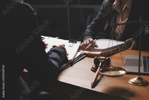 Attractive young lawyer in office Business woman and lawyers discussing contract papers with brass scale on wooden desk in office. Law, legal services, advice, Justice and real estate concept.