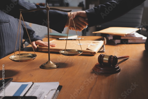 Attractive young lawyer in office Business woman and lawyers discussing contract papers with brass scale on wooden desk in office. Law, legal services, advice, Justice and real estate concept.