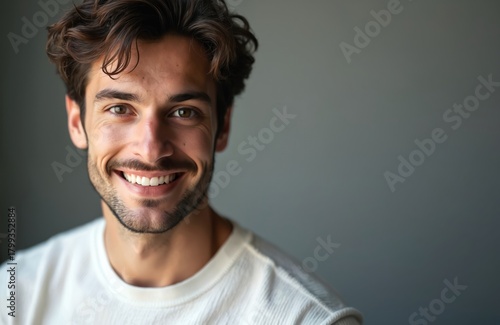 Attractive young man presents genuine smile in studio portrait. Wavy brown hair, clean complexion. Lighting highlights facial features creating sense of freshness, confidence. Image conveys