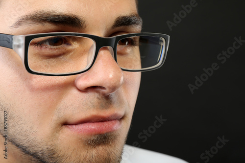 adult, attractive, background, black, boss, business, businessperson, closeup, confidence, confident, dioptre, executive, eyesight, face, female, frame, girl, goggles, grey, happiness, health, health care, male, man, manager, medic, medicals, medicine, model, modern, myopia, optical store, optic, optometry, people, pointing, pretty, see, specs, spectacle, style, successful, vision, wearing, woman, men at work, young