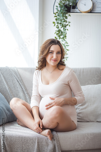 Attractive young woman expecting her baby to born. Beautiful pregnant woman indoors. Expectant at home.