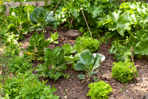 Au potager - Cultures associées de jeune plants de légumes en pleine terre : salade, choux, bette ou poirée, chicorée, rhubarbes