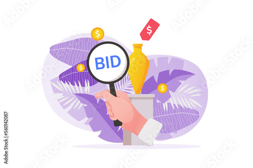 Auction concept with people hand in flat design. Buyer holding bids and competes with other customers for valuable vase lot at auction. Investment and buying arts. Illustration for web
