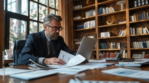 Auditor, side view, with audit reports on table in office generative ai