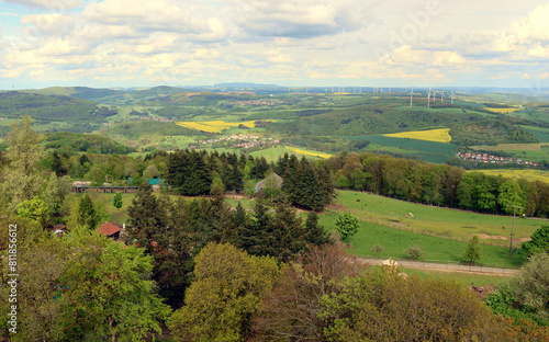 Aussicht ins Nordpfälzer Bergland vom Potzbergturm auf dem Potzberg in der Gemeinde Föckelberg im Landkreis Kusel im Bundesland Rheinland-Pfalz.