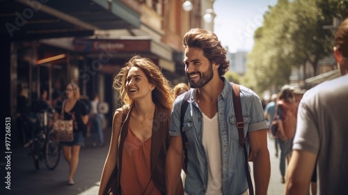 Australian Couple Walking Together on a City Street Photo. Fictional Characters Created By Generative AI.