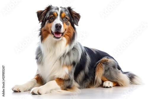 Australian Shepherd Dog Lying Down on White Background