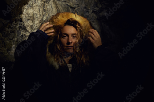 Authentic close up portrait of Caucasian female traveler, dressed in dark coat with foxy fur hood, hiding in cave from thunder, spending vacations in mountains hiking. Tourism and exploring concept.