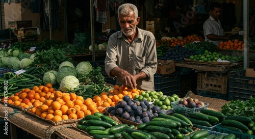 Authentic farmer offers fresh fruits and vegetables at local market stall