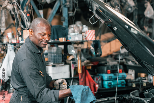 Auto mechanic diagnose and troubleshoots with tools and equipment. Polishing car, fixing braking and steering systems. Measuring oil levels with oil gauge stick and then pouring or changing it.