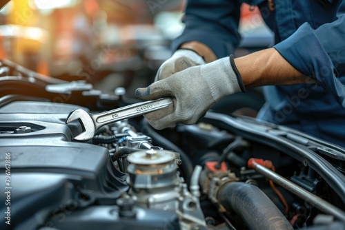 Auto mechanic repairing car engine in auto repair shop. Car service and maintenance concept
