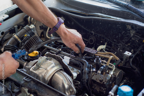 Auto mechanic repairing car. Selective focus.
