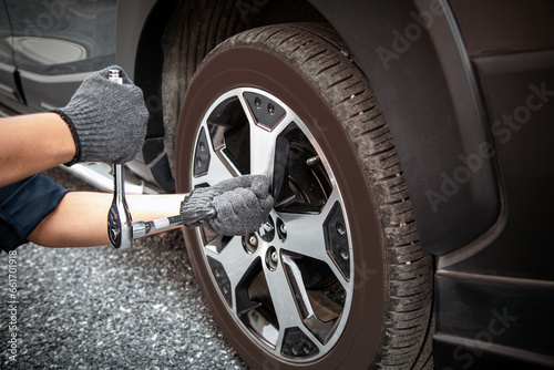 Auto mechanic use wrench to repairing and change car tires. Concept of car care service and maintenance or fix the car leaky or flat tire.