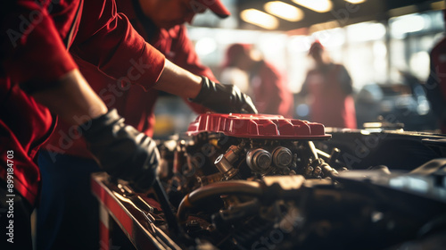 Auto mechanic working on car engine in mechanics garage. Repair service. authentic close-up shot