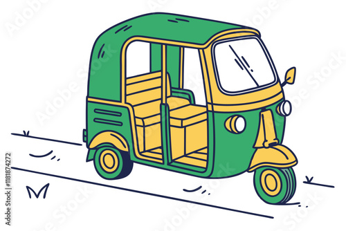 Auto rickshaw, tuk-tuk, three-wheeler taxi, green and yellow vehicle, Indian transportation, urban commute, compact design, cartoon style, vector illustration, side view, white background, transportat