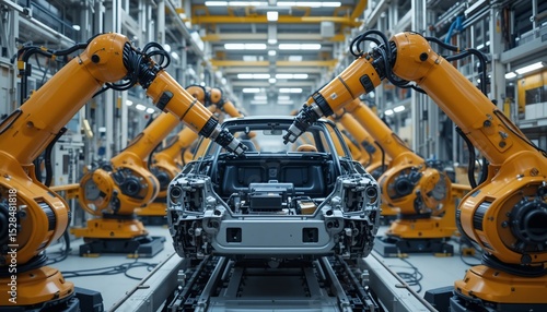 Automated Car Assembly Line Robots Manufacturing Vehicle Chassis in Modern Factory