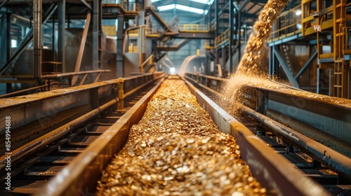 Automated industrial processing featuring heavy machinery and conveyor belts moving and handling large volumes of raw materials or bulk commodities within a manufacturing plant or warehouse facility